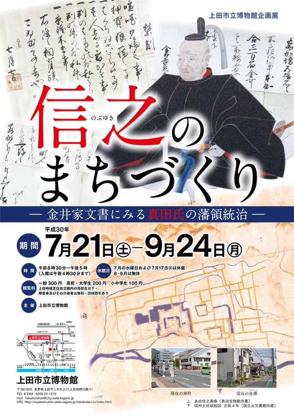 これは後日譚なのですが、今年の夏に上田市立博物館で行われた企画展「信之のまちづくり―金井家文書にみる真田氏の藩領統治―」に行かれた吉池さんから伺った話によりますと、現在の上田城下に見られる海野町・原町を整備したのは真田昌幸ではなく、信之が関ヶ原後に行ったものなのだそうで(整備を任された家臣の金井善兵衛宛ての信之の書状が残されている)、それによると既に上田城下にあった海野町を別の場所に移転するとともに、原之郷から町人を呼び寄せて原町とし、新たな町割が行われたのだとか。つまり、信之が整備するまでは現在の場所に海野町や原町といった城下町は存在していなかったことになるわけで、移転される前の海野町も含め、昌幸時代の城下町のほとんどは惣構えの内側に収まる程度の範囲であった(当時は武家屋敷と町人町との区別がそれほど明確ではなく混在していた)と考えられるようなんですね。ということは、関ヶ原以前の上田城をこの染屋城から眺めたとすると、惣構えの手前付近までは民家もまばらな荒地や田畑が広がっており、その向こうに小ぢんまりとまとまった城下町と城が見えたことになるわけで、なおさら「田舎の小城感」は際立っていたに違いありません。手痛い過去があるとはいえ、大軍勢の徳川軍がその慢心から上田城を再び侮ってしまったのもむべなるかな、といったところではないでしょうか。