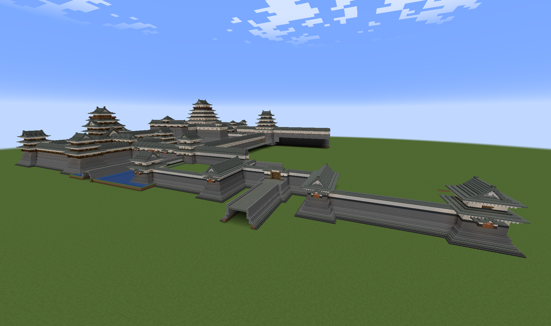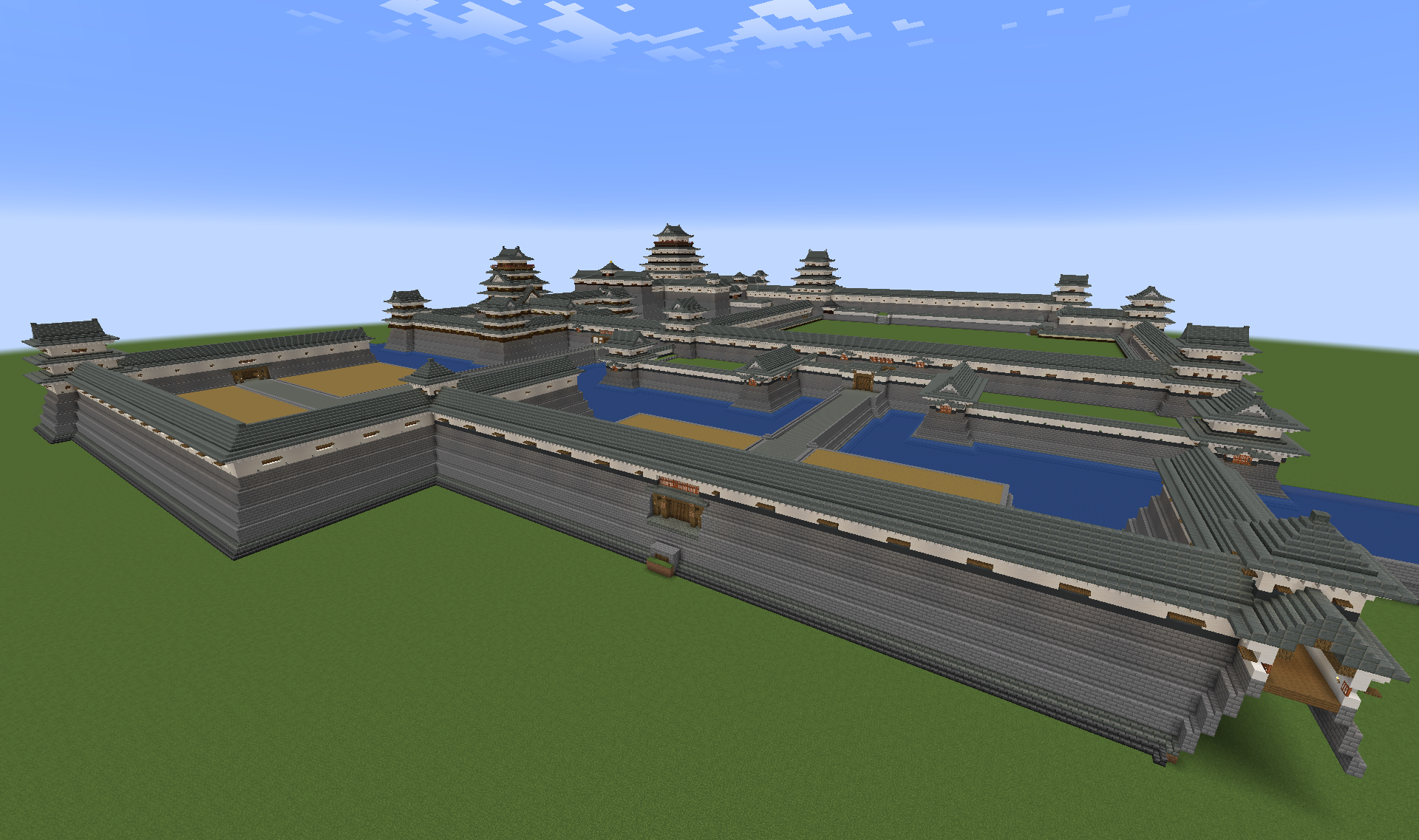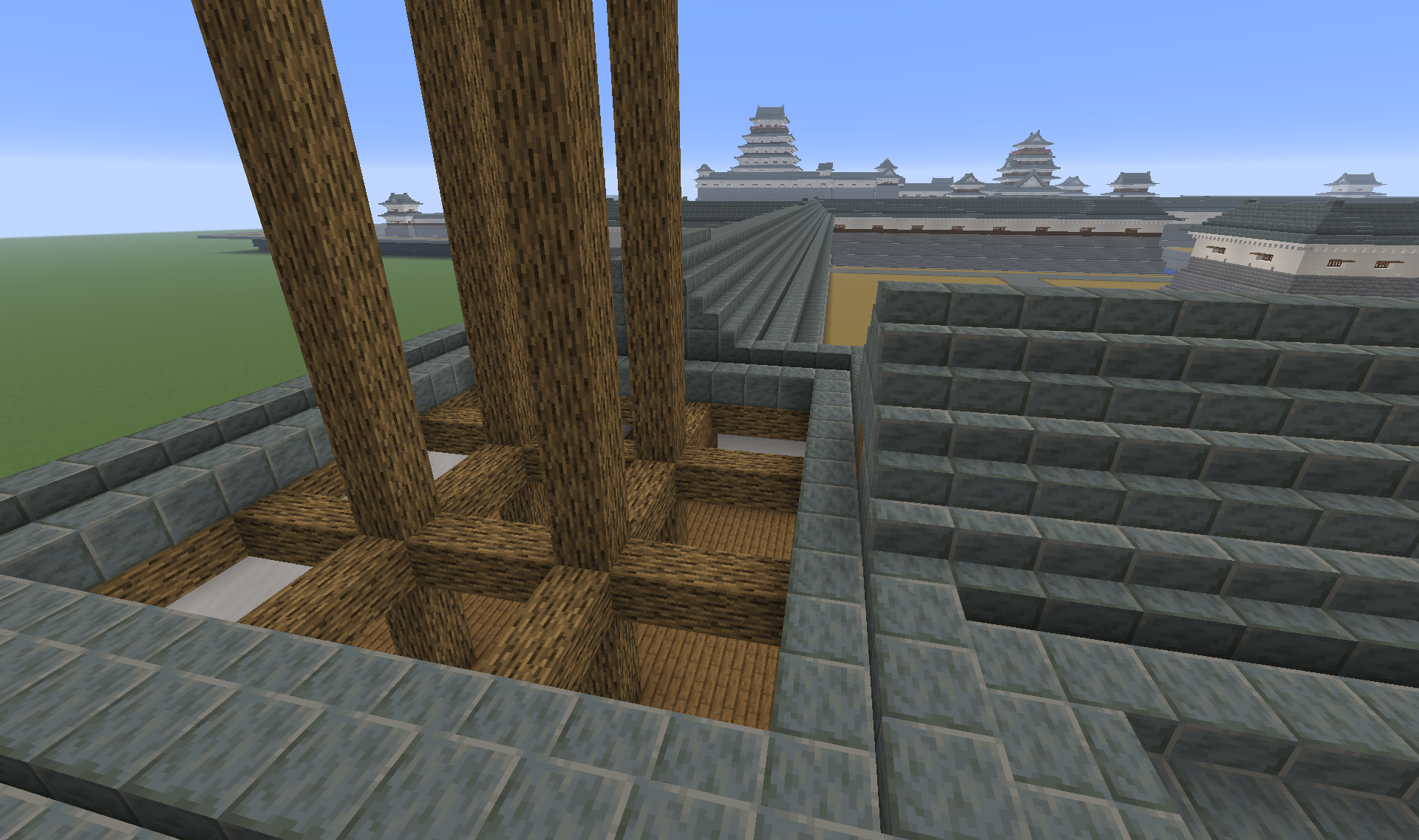 私は基本的に「城郭・縄張り」のマニアであって、マイクラのいわゆる「建築ガチ勢」ではないため、建造物の細部の表現については必要以上にこだわっていません。といいますか、近世城郭の最大の魅力はなによりもその折り重なる石垣や建築群のシャープなシルエットにあると考えていますので、ディテールの再現を求めるあまりゴテゴテ・モッサリした印象になってしまうのが嫌なんですよね。個人的にはこの程度でも十分に城郭らしさは出ていると思うのですがいかがでしょう?あと、城内に目立つ広大な空白地帯は御殿用・屋敷用の土地なんですが、現時点ではその一帯への建築は未定です(あくまで縄張りがメインなので)。