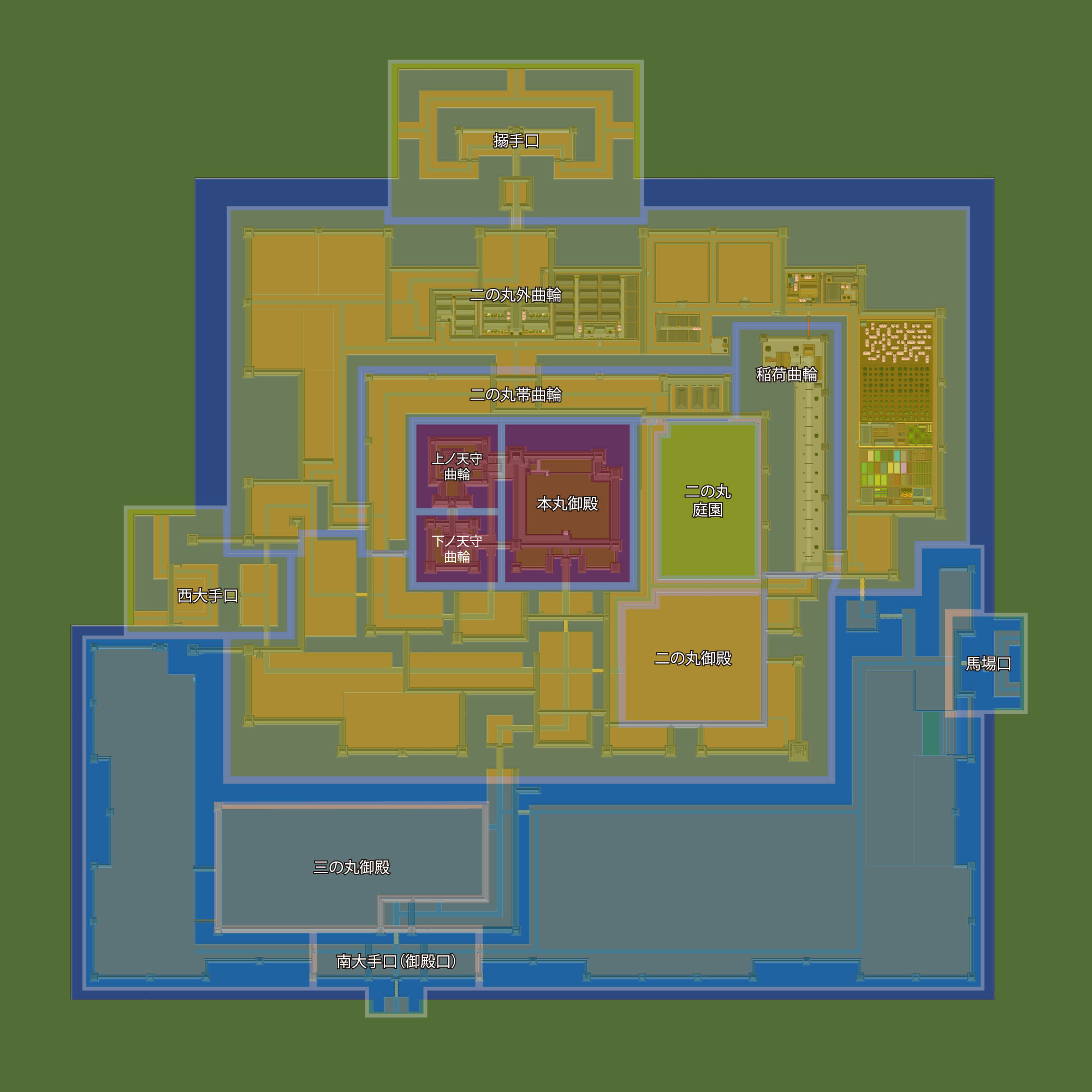 そしてこちらが上の縄張り図を元に実際にマイクラで建築した城のマップとなります。特に当たりも付けずに本丸から周辺へ向かって拡張していったため、ところどころ窮屈になってオリジナルの図面と違ってしまった部分があるのと、実際に立体化してみた結果、どうにも守りが弱そうに感じられる箇所が確認されてしまった場合のみ多少の変更を加えています。