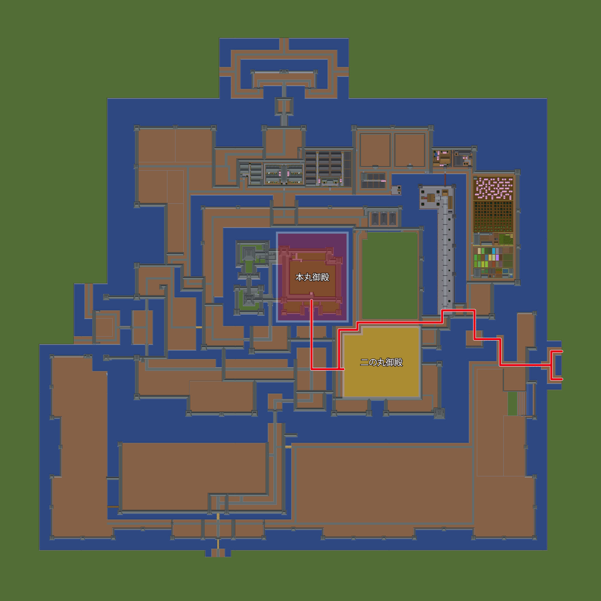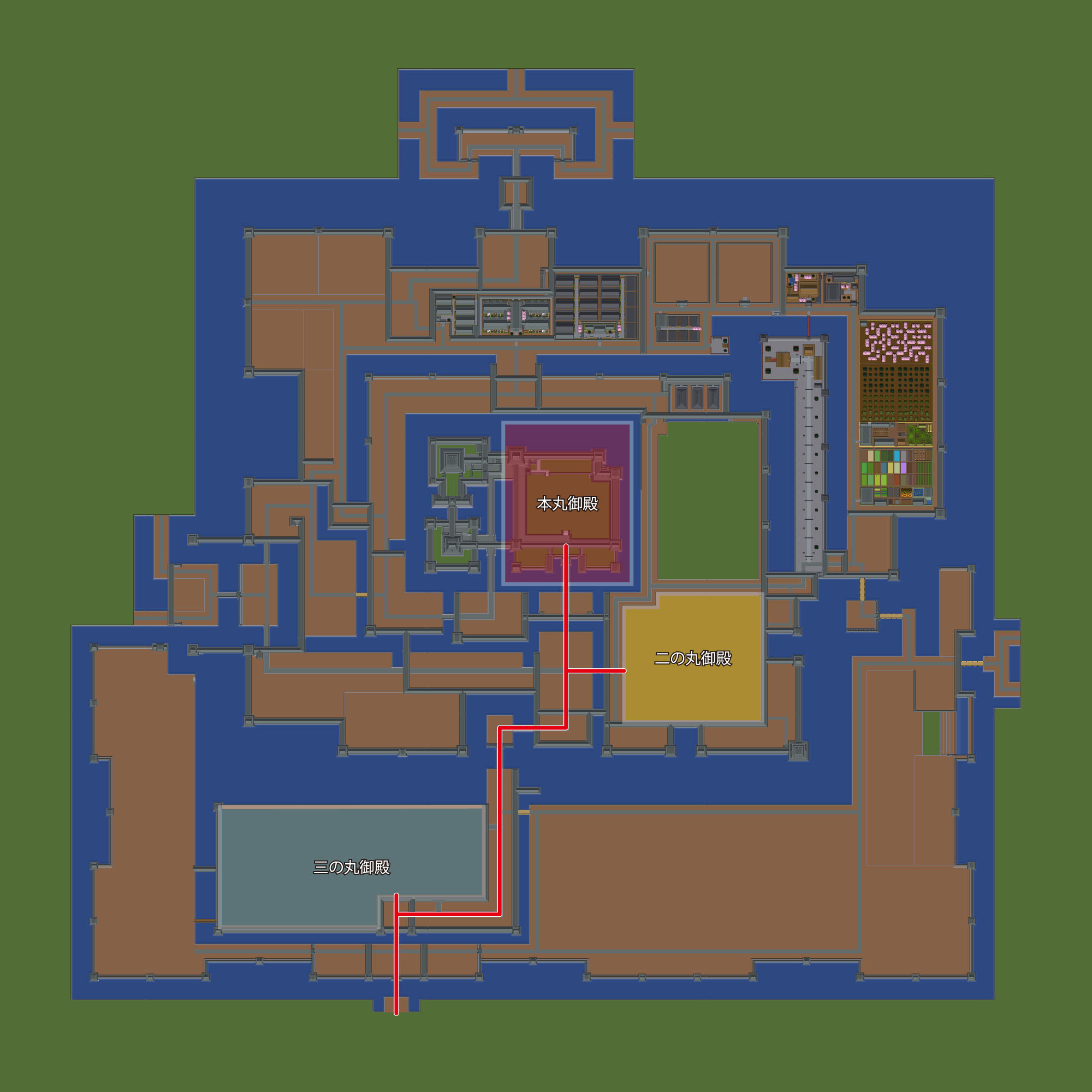 メインの登城ルートは2つあり、南大手口(御殿口)からは三の丸御殿・二の丸御殿を経由して本丸御殿へ、また西大手口からは二の丸御殿・本丸御殿へと、折れの少ない直線的なアクセスが可能となっています。もちろん、桝形等を多用して経路をより複雑にする方が常套的な手段かとは思うのですが、登城路をできるだけシンプルにすることが当時の私のこだわりだったようです。