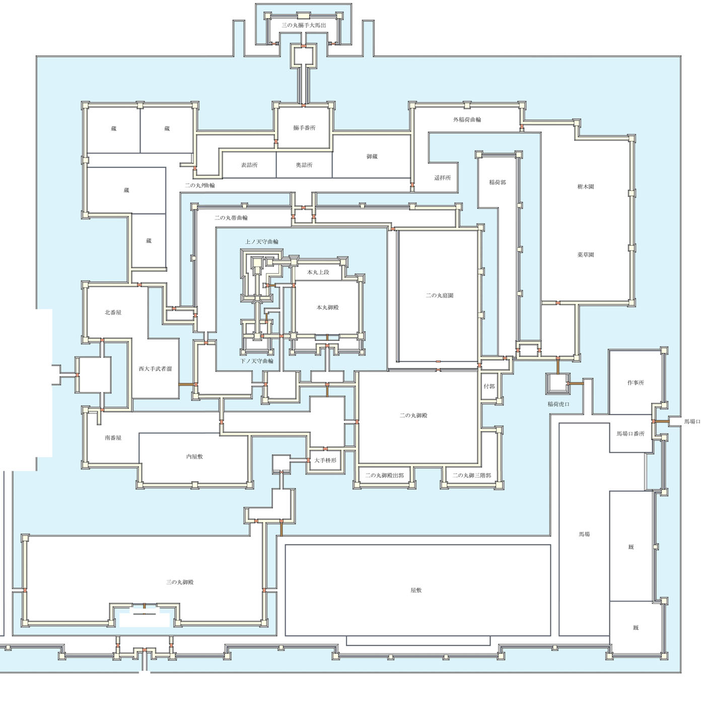 そしてこちらが上の縄張り図を元に実際にマイクラで建築した城のマップとなります。特に当たりも付けずに本丸から周辺へ向かって拡張していったため、ところどころ窮屈になってオリジナルの図面と違ってしまった部分があるのと、実際に立体化してみた結果、どうにも守りが弱そうに感じられる箇所が確認されてしまった場合には多少の変更を加えています。