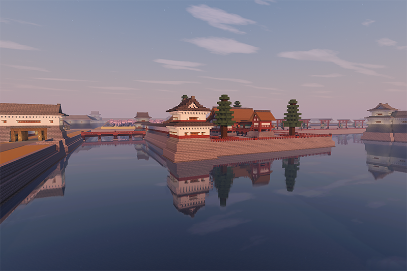 御殿や屋敷等の建築はいまのところ未定だと言いながら、実は外郭の一部についてはかなり作り込んでいたりします。細かい決まり事やルールが多くて面倒な御殿系の建物とは違って比較的自由度が高いエリアだったこともあり、想像力を膨らませつつ気軽に建築できたのはなかなか楽しかったです。また、そうやって作り込んだ場所を上の動画のようにシェーダー(影mod)を入れて眺めたりすると、より独特な味わいや雰囲気が醸されて良いですよね。